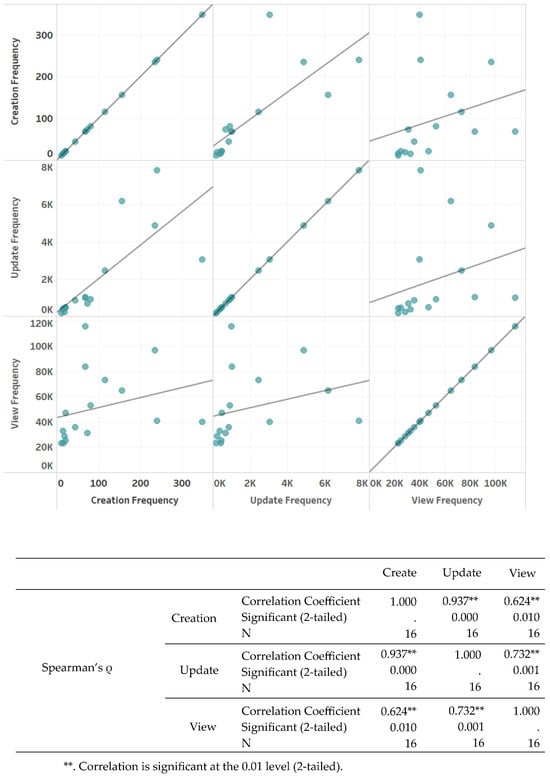 We investigated the correlation among the frequencies of data provision and consumption activities, including creation vs. update frequencies, creation vs. view frequencies, and update vs. view frequencies. The main purpose was to identify patterns of relationships between dataset provision and consumption activities. Spearman’s correlation coefficient (p) was used to analyze the non-normally distributed data. Figure 4 depicts the scatter plots of the activity frequencies along with the correlation values. The correlation coefficient for creations and updates, creations and views, and updates and views were 0.937, 0.624, and 0.732, respectively; all statistically significant values are at p < 0.01 and are two-tailed.