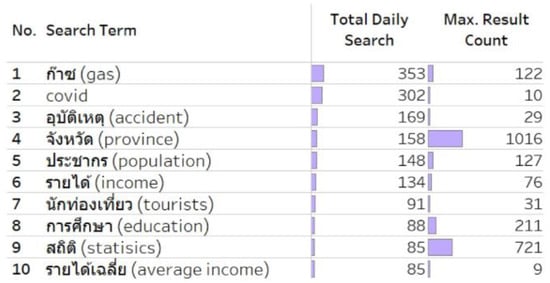 In this analysis, the top ten popular search terms were selected, excluding generic search terms. The results of the successful search terms are shown in Figure 5. These terms are considered to meet the portal objective (Q1). It was found that most successful search terms were short. Some of the common successful search terms include gas, COVID-19, accident, province, population, income, tourists, education, statistics, and average income.