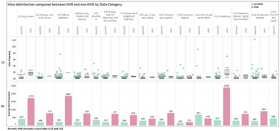 This study compared view frequencies of high-value datasets (HVDs) [51] with those of non-high-value datasets (non-HVDs) for each data category. Figure 6 presents (a) a boxplot of dataset view frequencies, and (b) average dataset view frequencies for HVDs and non-HVDs. The boxplots comparing HVD and non-HVD indicated that the HVDs generally received more average views in almost every data category. By analyzing the box plots, it was possible to identify non-HVDs with a high number of views, which could be potentially promoted to HVDs in the future. The bar charts in the figure further demonstrate the comparison of average views for HVDs and non-HVDs. The results indicate that, on average, HVDs received more views than non-HVDs. However, only (C11) Politics and Government had the average views of non-HVDs higher than HVDs. Additionally, none of the datasets in (C5) education and (C15) Tourism and Sport were defined as HVDs. The results suggested that the data users typically pay more attention to HVDs than non-HVDs. Thus, the portal manager should focus on providing and promoting HVDs on the portal. In addition, the analysis results can be used to assess and recommend selections of HVDs on the portal.