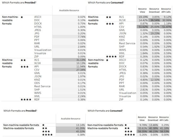 This study compared data provision activity indicators, i.e., the numbers of resources, across different available resource formats. Additionally, data consumption activity indicators, including the number of views, downloads, and API calls, were compared among different available resource formats. The resource formats were also grouped based on the five-star ratings according to the Berners-Lee’s principle. Figure 7 illustrates the comparison between available resource formats and their consumption by data users.