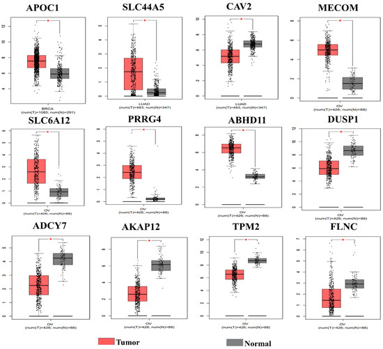 Expression of the selected genes validated from TCGA by using the GEPIA database for the respective cancers: APOC1 in breast cancer; SLC44A5 and CAV2 in lung adenocarcinoma; MECOM, SLC6A12, PRRG4, ABHD11, DUSP1, ADCY7, AKAP12, TPM2, and FLNC in ovarian cancer. Here, the red color represents tumor sample, the black color represents normal samples, and red asterisks indicate that the expression of the gene is significant in the particular cancer. BRCA: Breast Cancer, LAUD: Lung Adenocarcinoma, OV: Ovarian Cancer.