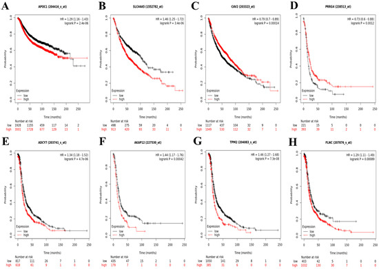 Prognostic value of mRNA expression of the genes in breast, lung adenocarcinoma, and ovarian cancer patients analyzed by KM plotter. (A) APOC1 in breast cancer; (B) SLC44A5 and (C) CAV2 in lung adenocarcinoma; (D) PRRG4, (E) ADCY7, (F) AKAP12, (G) TPM2, and (H) FLNC in ovarian cancer. Here, logrank p value e- represents e−. For example, logrank p value ‘4.76e-06’ should be read as ‘4.76 × 10−6’.