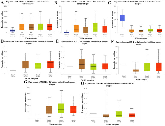 Expression of the genes associated with the different stages of particular cancers. (A) APOC1 in breast cancer; (B) SLC44A5 and (C) CAV2 in lung adenocarcinoma; (D) PRRG4, (E) ADCY7, (F) AKAP12, (G) TPM2, and (H) FLNC in ovarian cancer.
