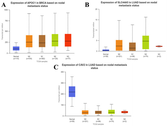 We also investigated the expression of these genes between tumor and normal samples on the basis of nodal metastatic status using UALCAN. Nodal metastatic status is indicated by the N0–N3 labels, where N0 represents no lymph node metastasis, N1 represents metastasis to 1–3 lymph nodes, N2 represents metastasis in 4–9 lymph nodes, and, lastly, N3 represents metastasis in 10 or more axillary lymph nodes. The results revealed that in patients with breast cancer, APOC1 is significantly increased (p-value < 0.01) in N0, N1, N2, and N3 stages in comparison to normal healthy individuals (Figure 5A). Compared with the normal individuals, the expression of SLC44A5 and CAV2 in lung adenocarcinoma patients is significantly increased and decreased (p-value < 0.01), respectively, in all the nodal metastatic stages compared to normal persons (Figure 5B,C). In both breast cancer and lung adenocarcinoma, these three genes did not significantly change within the N0, N1, N2, and N3 stages. There are no data available for the genes associated with ovarian cancer.