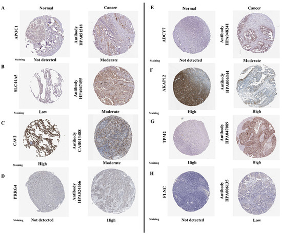 Protein expression of the genes acquired from the Human Protein Atlas database. (A) APOC1 in breast cancer; (B) SLC44A5 and (C) CAV2 in lung adenocarcinoma; (D) PRRG4, (E) ADCY7, (F) AKAP12, (G) TPM2, and (H) FLNC in ovarian cancer. Here, staining is in four parts: not detected, low intensity, moderate intensity, and high intensity.