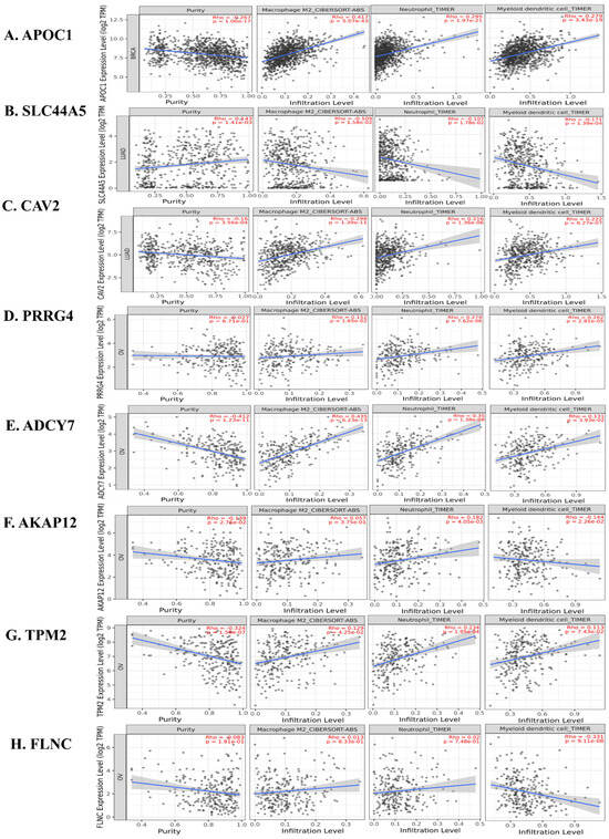 Prediction of immune cell infiltration with the expression of the genes in particular cancers. Correlation of immune cell infiltration with the expression of (A) APOC1 in breast cancer; (B) SLC44A5 and (C) CAV2 in lung adenocarcinoma; (D) PRRG4, (E) ADCY7, (F) AKAP12, (G) TPM2, and (H) FLNC in ovarian cancer. Here, the blue line indicates the trend in this correlation analysis, and each dot in the scatter plot represents a single tumor sample. Here, a positive correlation is denoted by rho > 0, and a negative correlation is denoted by rho < 0. Here, p value e- represents e−. For example, p value 9.11e-08 should be read as 9.11 × 10−8.