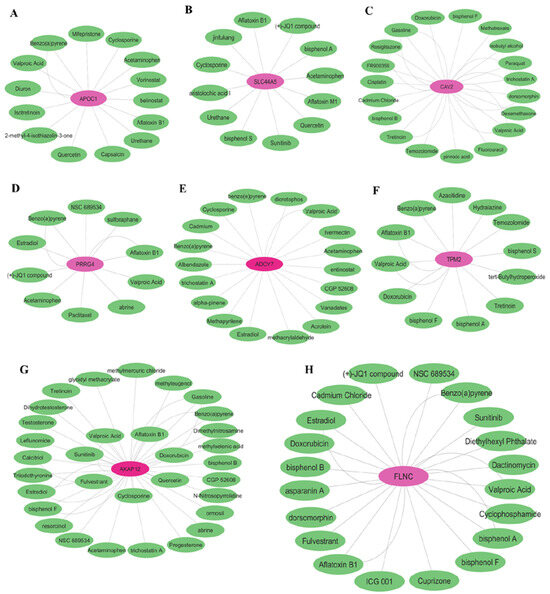 Chemical–gene interaction network established with the prognostically targeted genes. (A) APOC1; (B) SLC44A5; (C) CAV2; (D) PRRG4; (E) ADCY7; (F) TPM2; (G) AKAP12; (H) FLNC.