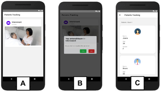 Figure 4. A—Home screen; B—App detecting the beacon; C—Patients’ information screen.