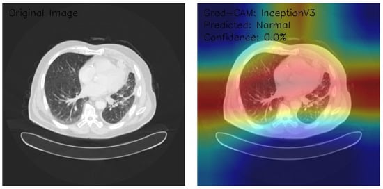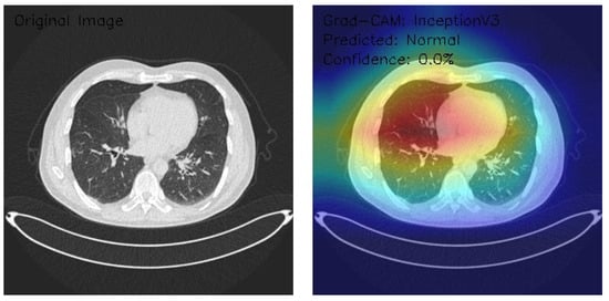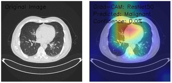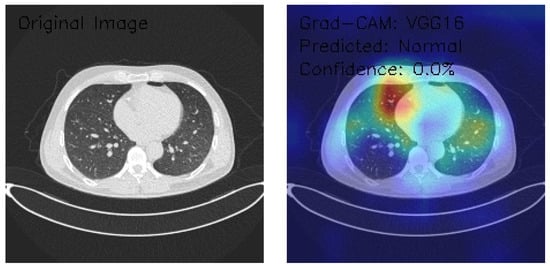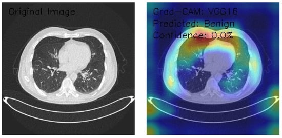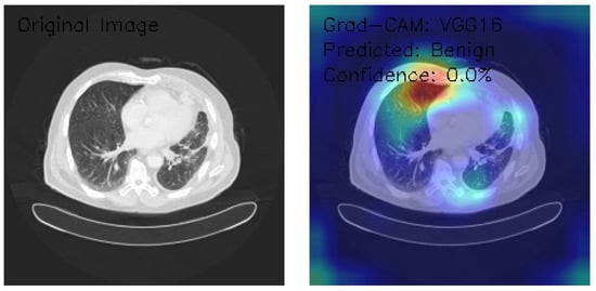 This study distinguishes itself from prior research by addressing critical gaps and advancing the application of deep learning in lung cancer detection. First, it achieves a higher test accuracy (98.18%) using the VGG16 architecture, surpassing the performance reported in similar studies, such as those by Kapoor et al. [] and Zargar et al. [], which focused on binary classification tasks. Unlike these studies, this research targets a more challenging three-class classification problem (Normal, Benign, Malignant), expanding its clinical utility. Furthermore, the comprehensive comparative analysis of VGG16 against ResNet50, MobileNetV2, and InceptionV3 under consistent conditions highlights the robustness of VGG16 in medical imaging tasks. A key contribution is the integration of Grad-CAM for interpretability, enabling transparent and trustworthy decision-making, which was rarely addressed in earlier studies.