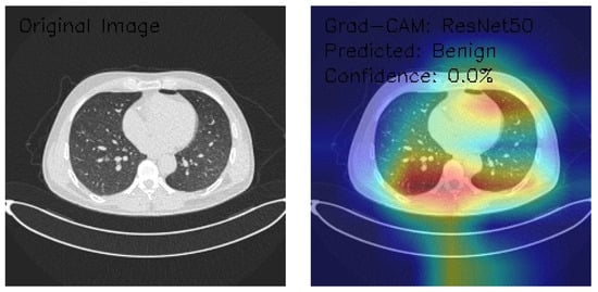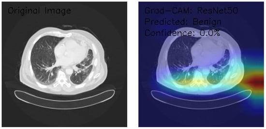 Figure 17 shows the CT image depicting clear lung fields, with Grad-CAM visualization showing focal activation in the right upper lung and notable attention to the hilar regions. The activation pattern demonstrates a right-sided predominance, suggesting the model’s sensitivity to specific anatomical features. Despite these observations, the model classifies the image as Benign with a confidence score of 0.0%, indicating significant uncertainty. This mismatch between detected features and classification confidence suggests the need for model recalibration, improved classification layer optimization, and enhanced confidence scoring mechanisms to ensure reliable and actionable diagnostic outcomes.