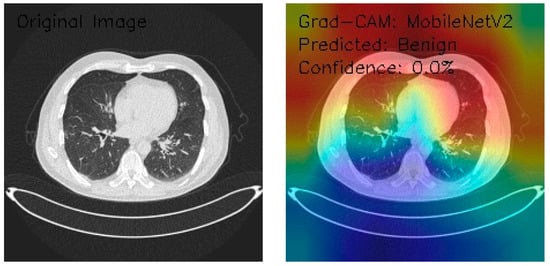 Grad-CAM visualization using MobileNetV2 for lung CT scan with benign prediction. (Source: author’s analysis from data, 2024).