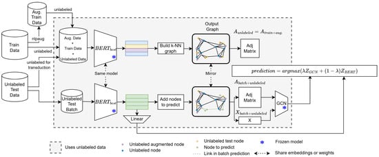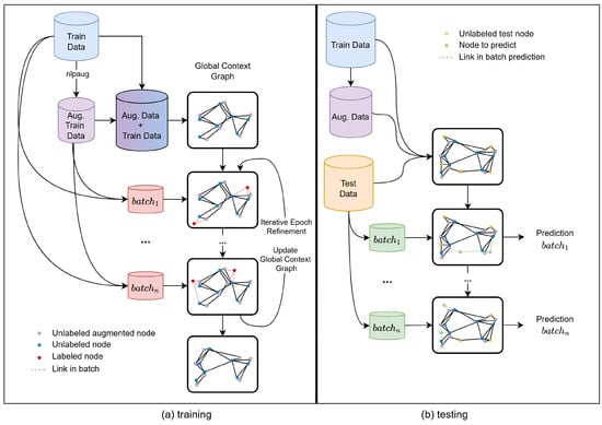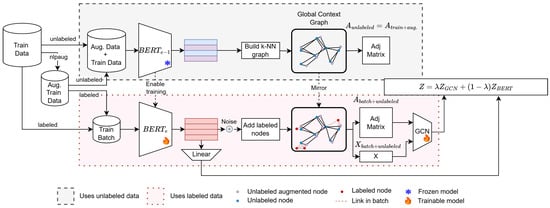 Table 1 presents examples of these transformations, demonstrating how these techniques preserve the overall meaning while enhancing dataset diversity. The selection of these techniques balances computational costs and performance improvement [,]. Data augmentation with nlpaug has two application points, as illustrated in Figure 1 within the cylinder labeled Aug. Train Data. The first application contributes to creating the Global Context Graph, which is represented in the gray space in Figure 1. The second is actively integrated into the training process through batches, which is represented in the red space in Figure 1.