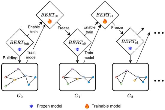 where and represent logits for the BERT and GCN flows, respectively, weighted by . denotes the Lambda Learner function, and is the sigmoid activation. At the end of each epoch, the BERT model is frozen, disabling its parameters for training while encoding new embeddings and updating the graph based on insights from the preceding epoch (Figure 3).
