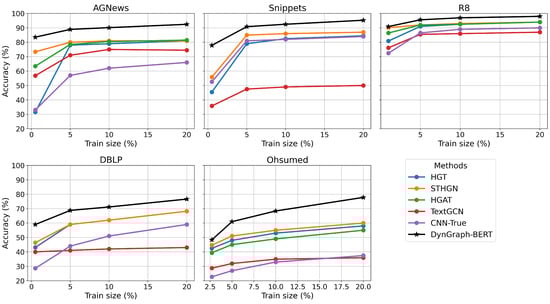 To evaluate the performance of DynGraph-BERT, we selected several baseline methods that use graphs in a semi-supervised setting for text classification, including TextGCN [], HGT [], HGAT [], and STHGN []. Additionally, we included classical CNNs [] for comparison purposes.