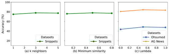 To understand the influence of hyperparameters on the method, we evaluated the minimum similarity level and the maximum number of k neighbors in experiments with the Snippets dataset. The results, averaged over 10 runs of the DynGRaph-BERT, are shown in Figure 6a,b. Figure 6c shows the variation of fixed values without the Lambda Learner mechanism, indicating a slight performance improvement when is closer to 1 or greater than 0.5. In the studies presented in Figure 6, the algorithm demonstrates high stability, with no significant changes in accuracy when varying the hyperparameter values.