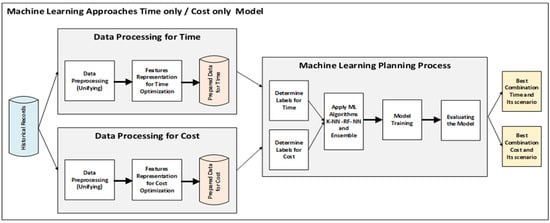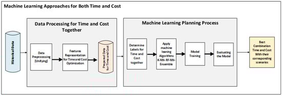 Within the family of supervised machine learning techniques, KNN has shown superior performance in classification tasks. Consequently, the KNN algorithm was chosen for the planning process due to its effectiveness in delivering solutions that closely align with customer orders. It is utilized to plan and assign the relevant category to the given order, suggesting the closest matching category for the generated solution. The weighted average regression method was chosen to determine the precise values of time, cost, or both, based on the optimal scenario identified by the KNN classification. Two statistical analysis methods (t-test and Wilcoxon) were applied to measure the K-NN performance vs. the rest of the algorithms. In the subsequent phase, the solutions generated by K-NN with regression are used as inputs for an optimization environment. On the other hand, in case of the limited availability of historical data, we developed a reinforcement learning model to optimize plans for achieving the minimum time and cost based on defined rules and prepare the agent environment. This environment includes state definition, action definition, and formulation of the reward functions for each model (time, cost, and both), aiming to refine these solutions. We conducted two types of comparisons: first, we evaluated the accuracy of various machine learning algorithms after optimizing the solutions. Second, we validated the results with experts’ estimations. Using machine learning in optimization led to remarkable outcomes, showcasing substantial reductions in time, cost, or both.