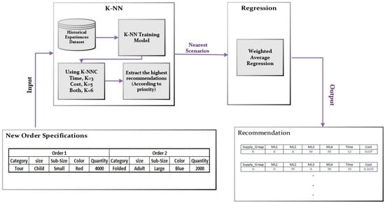 The K-NN algorithm was chosen from the other mentioned algorithms because it identifies the classes that best match the customer’s order. The output classes of scenarios extracted from KNN are considered the input of the regression to obtain the exact prediction of time, cost or both according to the customer order priority. Figure 5 illustrates the steps in using the K-NN and regression to predict the value of time, cost or time and cost together. After evaluating the accuracy of the K-NN algorithm as a classifier in aligning order specifications with historical data, the K-NN generates the highest-rated recommendations as per the specified K values. In the context of using KNN as a classifier, the scenario generated by the proposed model is compared with the scenarios classified by KNN by measuring the minimum distance between the generated scenario and the classified instances. Subsequently, a regression method is applied to determine the precise values of time and cost associated with the identified scenario. The advantage of using K-NN is it performs well with multi-class classification problems and does not make strong assumptions about the data distribution. But, K-NN’s performance can be reduced if the dataset contains irrelevant features. This can lead to improper predictions.