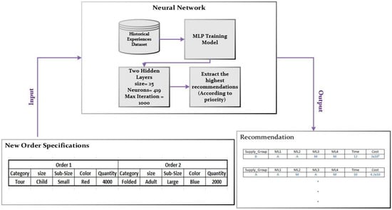 The dataset used in the proposed approach is built according to the historical transactions (experiences) of orders inside a bicycle manufacturer and their corresponding solutions. The dataset is built from scratch and consists of 6000 historical transactions of customers’ orders. Each customer can ask for up to three orders per transaction. The whole dataset contains the parameters represented in Table 1. The parameters of the dataset represented in Table 1 are bicycle category, the size of the bicycle, the sub-size of the bicycle, the color, the suppliers, the manufacturing lines, the operation type, the quantity, and the priority of the customer to minimize the time, cost, or both time and cost. Each parameter has its own values.