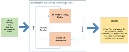 Reward Function: In this context, the reward functions (Equations (3)–(5)) aim to minimize the time only, cost only and both time and cost for the mass-customized order. The reward function serves as a guide for the planner, directing decisions towards the desired outcome. The reward function for time (Equation (3)) is to minimize the total time consumed in manufacturing lines (j) and total time of supplying the bicycle parts. The cost reward function is to minimize the summation of operation costs for the four manufacturing lines in addition to the summation of the cost of all parts multiplied by the quantity and the fixed value of the overhead. This term, 1000 + 500Bj, indicates that the minimum quantity is 1000, and any additional orders must be in increments of 500 bicycles. The time and cost reward function (Equation (5)) is defined as the minimum of the weighted sum of the time and cost reward components, where the weights are equally distributed, with each component contributing half.