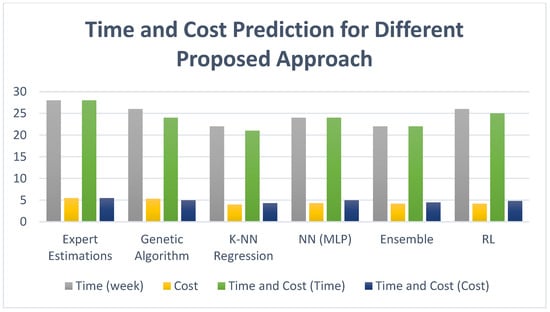 Figure 9 shows the prediction values of the approaches mentioned in Table 9. As shown, K-NN with regression gives the minimum time and cost and both time and cost together. The time values are measured in weeks, while the cost values represent the amount multiplied by 106 dollars.