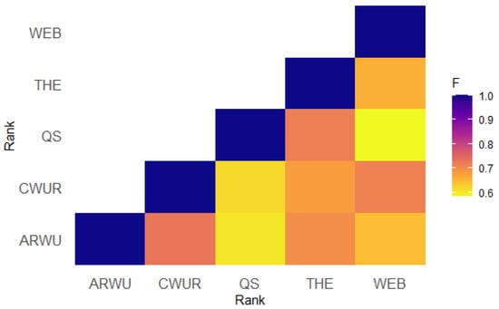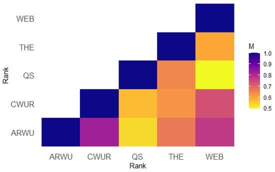 In the landscape of global university rankings, it is essential to recognize the diverse opinions and methodologies that shape these evaluations. Each ranking system utilizes distinct objectives, criteria, and data sources, resulting in differing positions for the same institutions [24]. This variability highlights the challenges of directly comparing universities and achieving a consensus on their performance. Consequently, a distinction approach to interpretation is necessary. To identify which rankings are most similar, we selected five world university rankings for a comparative analysis of the positions held by higher education institutions across these lists.