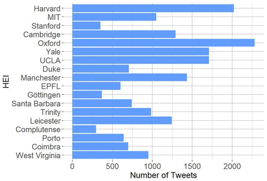 Following the selection of the analysis period, our analysis aims to uncover patterns and key trends within the posts, providing insights into each institution’s communication patterns and engagement levels. The analysis of the data in Figure 4 and Figure 5 reveals that the University of Oxford leads in tweet frequency, significantly surpassing institutions like the Complutense University of Madrid, which shows distinctly lower activity. Stanford University, despite its high global ranking, exhibits a unique behavior with only 351 tweets during the analysis period, making it the second least active institution and the only one not surpassing 1000 tweets for the top five. Across most universities, the majority of posts are original tweets rather than replies or retweets, indicating a strategy that emphasizes broadcasting information over active engagement. MIT and the University of Porto are notable exceptions, each engaging minimally through replies and retweets, respectively, with the University of Manchester standing out by allocating 55% of its posts to replies, the highest proportion among the analyzed institutions. Additionally, only four universities, the University of Porto, the University of California Santa Barbara, the University of Göttingen, and EPFL, utilize all three types of posts, demonstrating a more balanced communication approach.