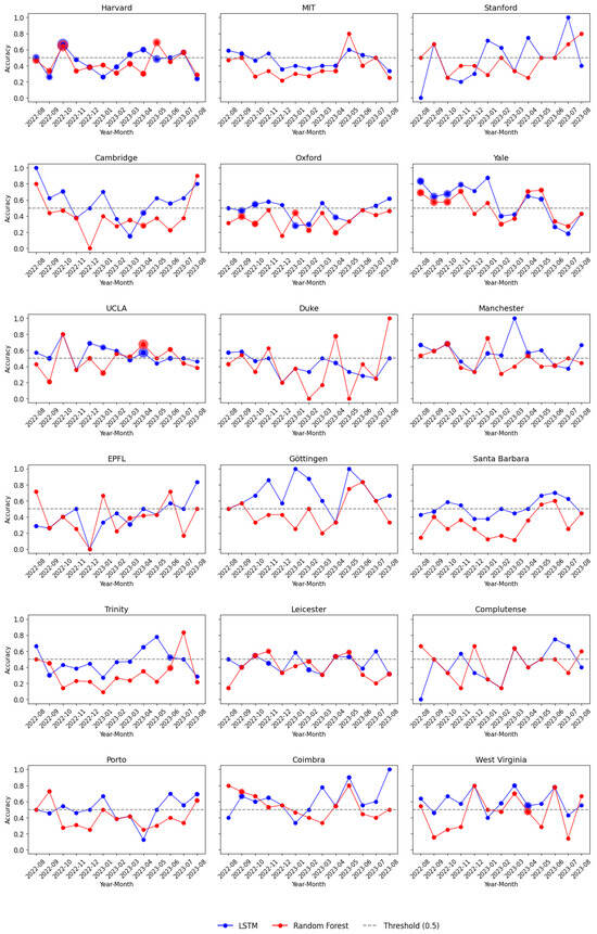 To evaluate the performance of the machine learning models throughout the academic year, we present the results for LSTM and Random Forest in Figure 9 and Figure 10. Figure 9 illustrates the monthly accuracy for each of the 18 higher education institutions (HEIs), with point sizes indicating the number of publications shared during the last five days of each month.