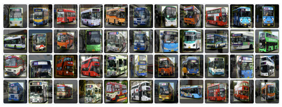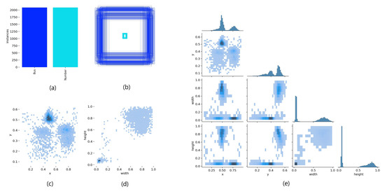 Figure 2a illustrates the number of annotations per class within the dataset. Figure 2b visualizes the distribution of bounding boxes by showing their locations and sizes, which helps assess the variety in their placement and dimensions to ensure effective object recognition. Figure 2c,d present the statistical distribution of bounding box positions and sizes, depicting how these boxes are spread across the dataset. Figure 2e provides a detailed analysis of label distribution, revealing whether the bounding boxes are evenly distributed or if certain parts of the dataset are denser. This analysis is crucial for verifying that the model can accurately detect objects across varying sizes and positions in the images. The dataset comprised a total of 2936 images, with 70% allocated to the training set (2067 images), 20% to the validation set (575 images), and 10% to the testing set (294 images). The dataset covers a variety of bus shapes, colors, and sizes to enhance the model’s adaptability to different real-world environments.