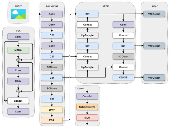 A significant architectural advancement in YOLOv10 is its use of an enhanced variant of the Cross-Stage Partial Network (CSPNet) [26], which optimizes gradient propagation and reduces computational redundancy. This results in superior feature extraction, which helps the model maintain computational efficiency while improving performance. The neck module in YOLOv10 also integrates a Path Aggregation Network (PANet) layer [27], which facilitates effective multi-scale feature fusion, further improving detection accuracy across objects of various sizes.