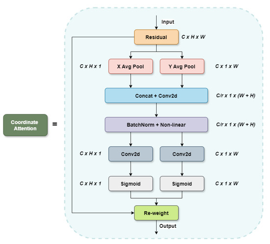 where denotes the sigmoid activation function. Finally, the outputs and are unfolded and utilized as attention weights. The final output of the Coordinate Attention Block, denoted by Y, is expressed in Equation (10):