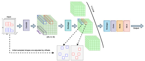 where Lx represents the adjusted coordinate for the irregular convolution, L0 is the initial sampling coordinate, and reflects the offset adjustment. Based on these adjusted coordinates, input feature maps are resampled, and the resampled maps are processed through the convolution layer, yielding the final output. The functional expression for AKConv’s variable kernel convolution can be formalized in Equation (12):