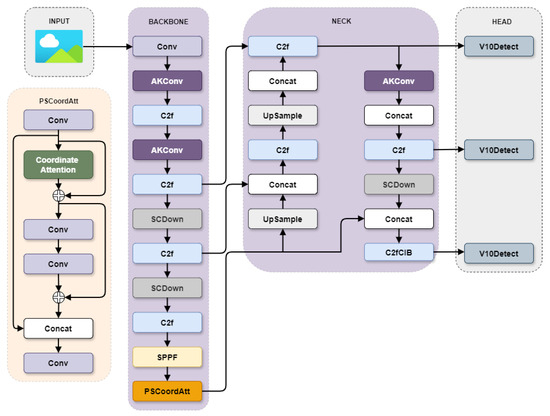 The integration of Coordinate Attention (CA) and Adaptive Kernel Convolution (AKConv) into the YOLOv10 model significantly enhances its detection precision and efficiency. CA modules are strategically placed within the Cross Stage Partial (CSP) blocks, immediately following the convolutional layers in the backbone. This arrangement allows for the early and efficient enhancement of feature maps, directing the network’s focus to critical spatial regions. By improving the model’s ability to capture and process essential spatial information, CA contributes to increased accuracy and efficacy in object classification, particularly in complex scenarios.