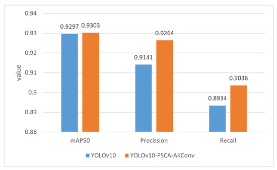 Comparison of YOLOv10 and YOLOv10-PSCA-AKConv Performance Metrics.