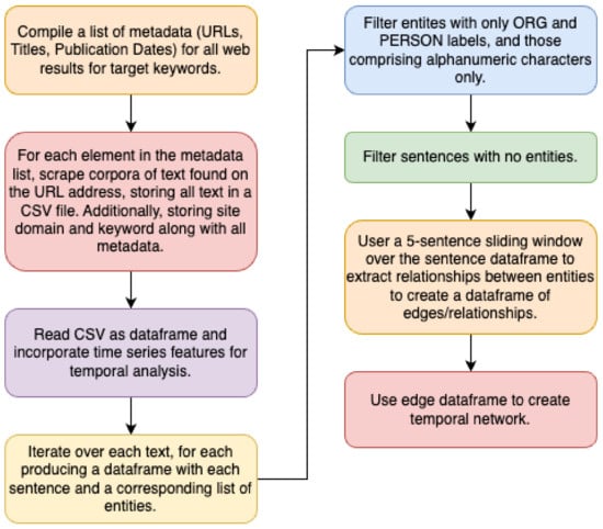 This study was designed as shown in Figure 1: (1) collect metadata (e.g., URLs, titles, publication dates) from online resources such as PDFs and web pages that contain references to target keywords, (2) collate a corpus of texts using collected metadata from search results, (3) automatically identify and classify key entities and actors involved in the DSbD landscape, (4) preprocess entities by filtering out those that contain non-alphanumeric characters, (5) extract entity relationships using a co-occurrence approach based on a five-sentence window, and (6) visualise and analyse chronological temporal networks.