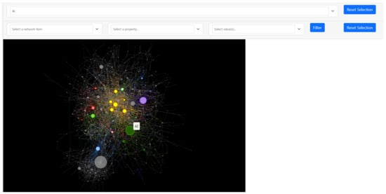 Given the large size and its sparsity, visualising the network was essential for understanding the structure and dynamics of the DSbD landscape. To produce visualisations, Pyvis (version 0.3.2), a Python library that leverages vis.js to create interactive, browser-based visualisations, was used. The HTML-based visualisations generated by Pyvis allow for rich interactions with the network, enabling users to hover over nodes to explore their connections and groupings. Figure 4 illustrates how users can filter and search nodes based on various criteria, such as “AI”, offering a deeper understanding of the relationships between key players and helping to uncover trends such as the concentration of influence around certain entities or the emergence of new connections.