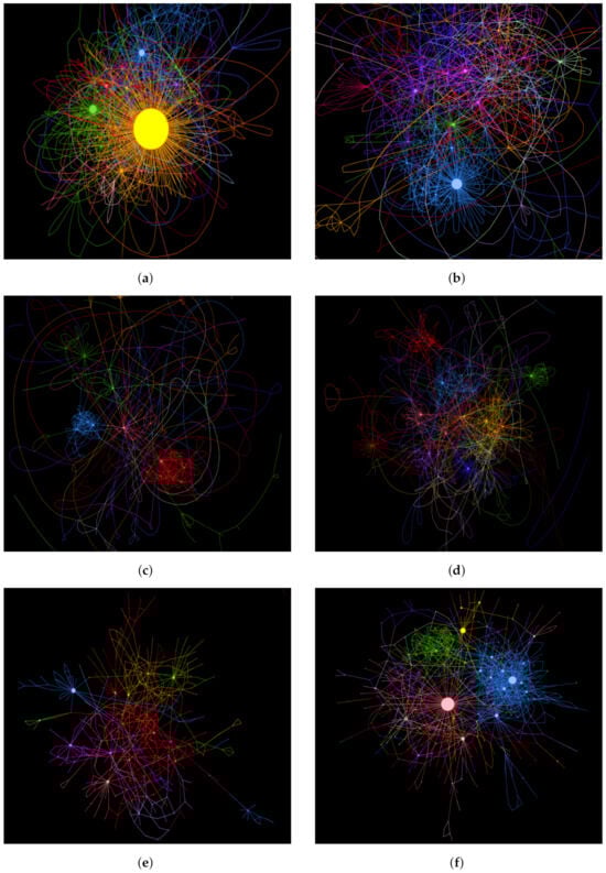 Network visualisations illustrating data from 2019 to 2024: (a) 2019, (b) 2020, (c) 2021, (d) 2022, (e) 2023, (f) 2024.