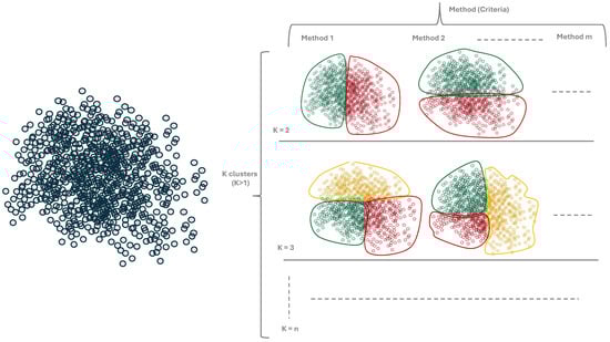 A simplified overview of the clustering concept (Figure 1) assumes two main generic driving factors that determine the result: the method, understood as the technique to cluster data, and the number of clusters to consider. The former defines the similarity criteria, while the latter is normally estimated heuristically (e.g., by adopting the elbow method [30]). A relatively recent work [31] proposes a consistent taxonomy of clustering approaches. It distinguishes between two main classes (hierarchical and partitional) and defines a number of sub-classes accordingly.