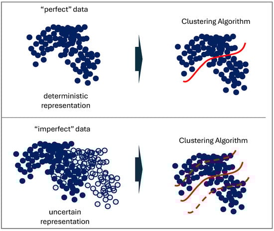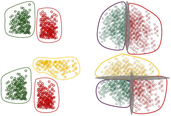 Depending on the nature of the considered data (e.g., dimensionality), its distribution in the space and the adopted clustering technique, we may observe considerably different areas of potential overlapping (Figure 2). Such areas normally include data objects that are similar with characteristics that are borderline, meaning that their association with one cluster or another is determined by small values of the considered metrics. It intrinsically suggests a probabilistic approach over a more traditional Boolean logic to associate a data point to a given cluster. Indeed, probabilistic models potentially allow for uncertainty identification, as well as its quantification and consequent incorporation as part of the algorithm output. For applications that are sensitive or critical in nature (such as, among many, medical diagnostics, cybersecurity, and decision making), the clustering-induced uncertainty may be as impactful as the more explicit underlying data uncertainty.