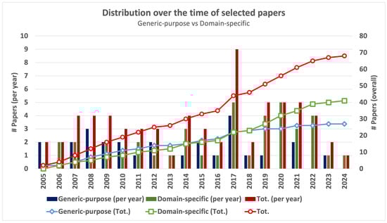 In quantitative terms, the majority (62%) of the 68 papers selected within the time range 2005–2024 are journal articles. A similar percentage (60%) presents a domain-specific focus. As shown in Figure 4, such a trend becomes more consistent and somehow predominant from 2018 onward. More holistically, the study confirms a substantial research interest in the topic throughout the observation period.