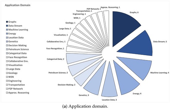 The analysis conducted in this study, based on soft classification, provides us with an overview of the application domain (Figure 5a). Looking at the 41 domain-specific papers, as expected, generic application fields, such as graphs, data stream, and machine learning, are quantitatively more relevant, both with large domains (e.g., energy, genetics, and location data). At a more fine-grained level, the review has identified a diverse spectrum reflecting a generic need for clustering in the presence of uncertainty.