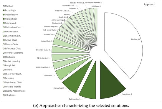 A more technical perspective is summarised in Figure 5b. A consistent amount (38%) of the considered papers propose a mixed-method approach, which is generically referred to as method in the adopted analysis framework. While potentially valuable in a domain specific context from an application perspective, in general terms these works are less prone to generalisation or actual innovation in the field. Fuzzy Logic, Optimization, and Hierarchical Clustering are the most popular approaches. They intrinsically constitute the backbone of the identified body of knowledge by providing reference solutions in the field. In addition, to note, a focus has been placed on analysis frameworks, on Multi-view Clustering, Probability Distribution Similarity, Ensemble and Active Clustering. This last set of works may be understood as a further consolidation by providing a variety of techniques and methods to adapt to the different applications.
