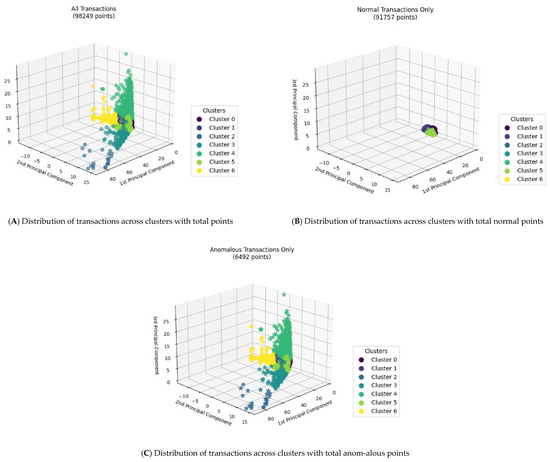 Figure 3 shows the distribution of the transactions in a 3D feature space, and each plot focuses on a different subset of the data. The first figure on the left displays every transaction (normal and anomalous) color-coded by cluster. The figure shows how the transactions are grouped in space and which clusters are dominant. The figure in the middle represents the normal transactions only, color-coded by cluster. This plot shows which clusters mostly contain normal transactions and how they are positioned in the feature space compared to the figure on the left. Furthermore, given the state of the transactions, we can clearly see that some clusters are barely visible in the figure, especially if they have a smaller number of normal transactions. Finally, the figure on the right represents the anomalous transactions only, color-coded by cluster. This figure clearly shows which clusters contribute the most to the detected anomalies, with clusters with large numbers of anomalies appearing more prominently in the figure. Overall, these visualizations illustrate how the clusters separate out in a 3D space and where the normal versus anomalous points lie. They help to identify which clusters are predominantly normal, which ones are primarily anomalous, and whether the anomalies are tightly grouped or dispersed.