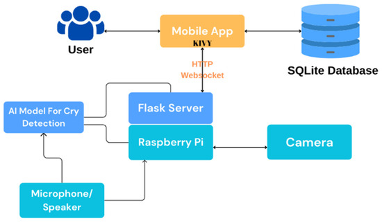 While the system architecture includes a camera component, it is important to emphasize that our deep learning model for cry detection processes exclusively audio data. The camera functionality runs parallel to, but separate from, the audio analysis pipeline, serving purely as a remote monitoring feature to allow parents to visually check on their child after receiving a cry detection alert. This design choice reflects real-world usage scenarios where audio monitoring for distress detection operates continuously, while video streaming might be activated on-demand to reduce bandwidth and storage requirements. Throughout our experimental evaluation, only audio features (spectrograms and MFCCs) were used for the classification task, with no visual data involved in the cry detection process.