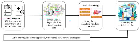 The dataset was collected from an openly available source [35] and comprises multi-modal data from over 75,000 clinical case reports. We mapped unstructured clinical notes to ICD-10 codes using fuzzy matching with the FuzzyWuzzy Python library version 0.18.0, which uses Levenshtein distance to compute string similarity. A similarity criterion of ≥85% was used to ensure accurate and meaningful matches. Clinical notes were then categorized into two categories based on the ICD-10 codes: “A15–A19”, classified as “Tuberculosis”, and “J00–J99”, categorized as “Non-Tuberculosis”, such as asthma, pneumonia, viral infections, fungal infections, and other lung-related diseases. After applying this labeling process, we obtained 1743 clinical case text data. Figure 1 illustrates the process of converting unlabeled clinical text data into a labeled format using fuzzy matching with ICD-10 codes. This transformation effectively converted the dataset into a labeled format, enabling a structured analysis and model development. In the Supplementary File, Tables S1 and S2 present the distribution of clinical notes labeled as TB and non-TB using the fuzzy matching technique with ICD-10 codes. The data were split into 80% training and 20% testing data.