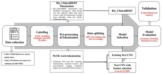 In the pre-processing steps, we employed the NLP rule-based pre-processing of the clinical notes for the two models, which are the existing Text CNN and proposed Text CNN with t-test models, such as lowercase text to convert all the texts into lowercase to ensure uniformity and reduce variability. Numerical values were replaced with their word equivalents for consistency, and medical measurement units were converted into their full word forms for standardization. Lemmatization was applied to reduce words to their base or dictionary forms. Common, non-informative words (stop words) and possessive markers like “s” were removed, and the text was tokenized into individual words or tokens for further analysis. A detailed summary of the text pre-processing steps applied before the model training is provided in the Supplementary File, Table S3. In contrast, the Bio_ClinicalBERT model does not require manual pre-processing, as its transformer-based architecture automatically handles text normalization using a self-attention mechanism to process the text. The framework of this study is illustrated in Figure 2.