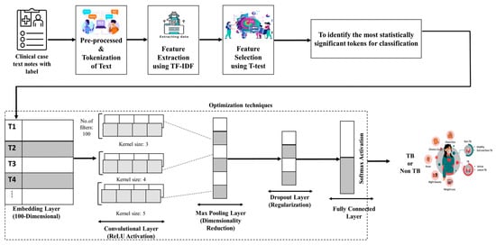 To further refine the input features for the Text CNN model, we applied a combination of Term Frequency–Inverse Document Frequency (TF-IDF)- and t-test-based feature selection. TF-IDF was used to quantify the importance of words within the clinical test corpus, while the t-test was employed to identify statistically significant terms that contribute to distinguishing between TB and non-TB clinical case reports. This approach helped to eliminate irrelevant words, reduce noise, and enhance the performance of the model. Figure 3 illustrates the framework of the proposed model, enhanced via t-test feature selection.