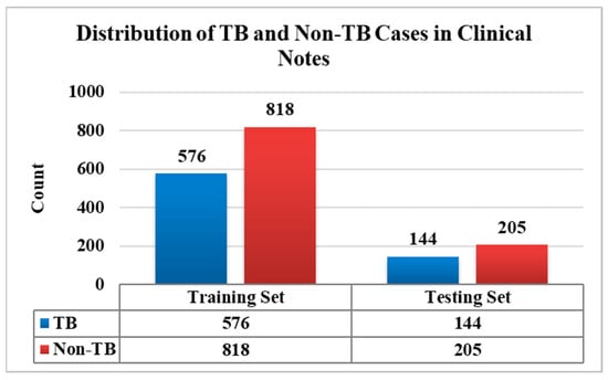 A proper and precise diagnosis is essential for improving patient outcomes and preventing the spread of TB, which remains a major worldwide health burden. Clinical, radiographic, and microbiological examinations have been used to diagnose TB; however, a greater amount of patient information is now stored in EHRs, often in the form of unstructured clinical notes. In the present study, we utilized a dataset comprising 1743 clinical notes, which was split into 80% (1394 clinical notes) for training while the remaining 20% (349 clinical notes) were used for testing the models, as depicted in Figure 4. All the analyses were carried out in Python version 3.11, using several essential libraries that support DL and NLP. The Natural Language Toolkit (NLTK) facilitated the initial text-preprocessing tasks. The Hugging Face Transformers libraries provide access to pre-trained language models, such as Bio_ClinicalBERT, which are made especially for processing medical text data, enabling the extraction of meaningful features for clinical notes. DL frameworks like PyTorch and TensorFlow were used to train and fine-tune neural networks on unlabeled data. Keras, with a high-level Application Programming Interface (API), supports flexible and accessible model implementation. Scikit-learn played an essential part in statistical feature selection (t-test), model assessment (using precision, recall, and F1-score), and validation. The integration of DL with statistical feature selection techniques improved the clinical text analysis, resulting in a more reliable and effective approach to TB prediction from unstructured clinical case data.