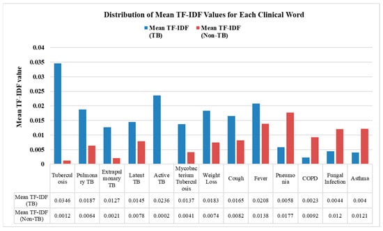 The Text CNN with the t-test model enhanced the input by selecting 1741 statistically significant tokens for training. To assess the statistical significance of these differences, we conducted a t-test comparing the TF-IDF distributions for each keyword across the TB and non-TB groups, identifying terms with significant differences (p < 0.05). This test determines whether the observed differences were statistically meaningful or likely due to random chance. The mean TF-IDF values of each clinical keyword associated with TB and non-TB patients are shown in Figure 5. Blue bars represent the mean TF-IDF values for TB-related keyword terms, while red bars represent those found in non-TB clinical notes. These differences highlight the distinct importance of certain terms in TB versus non-TB. For instance, keywords such as “Tuberculosis”, “Active TB”, and “Mycobacterium tuberculosis” have notably higher mean TF-IDF values, of 0.0346, 0.0236, and 0.0137, respectively, in TB-related clinical notes. In contrast, terms like “Pneumonia”, “Fungal Infection”, and “Asthma” show higher relevance in non-TB cases, with mean TF-IDF values of 0.0177, 0.012, and 0.0121. By retaining only statistically and clinically relevant terms, this feature selection step improves both the robustness and interpretability of the model, allowing it to leverage validated linguistic markers in the classification of TB and non-TB clinical notes.