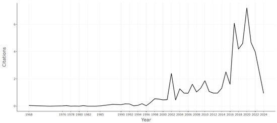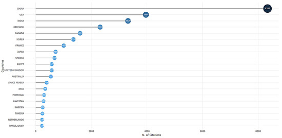 We included an overview of the most cited studies, by the total number of citations (Figure 16) and by the articles’ average citations (Figure 17), which was conducted in relation to the countries of origin, with the aim of pinpointing key periods in the field’s progression and the most influential research hubs globally.