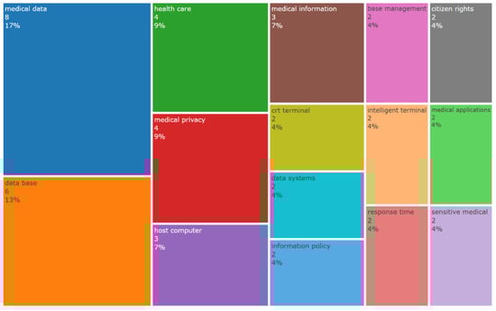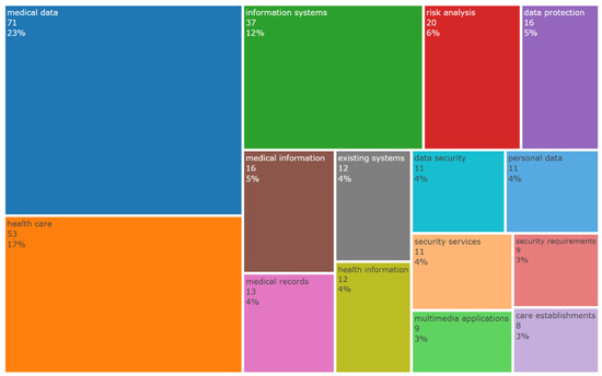 From 2000 to 2015, the abstracts demonstrate an ever more significant focus on “medical data” (Figure 5). This could be related, in part, to the steady development of Big Data, starting from the 1990s but gaining significant traction from 2012 onward [39], as it plays an important part in research and medicine. Emerging themes such as “access control”, or the combinations of “electronic health” or “electronic medical” and “health records” and “medical records” signaled the widespread adoption of EHRs and the challenges of managing access and privacy in digital environments. Technologies such as “cloud computing” started gaining attention in the scientific community. In addition, this time period demonstrated a noticeable focus on medical images, which probably corresponds to the integration of picture archiving and communication system (PACS) with radiology information systems (RIS), a type of imaging-specific EHR that greatly improved the workflow of radiologists [40].